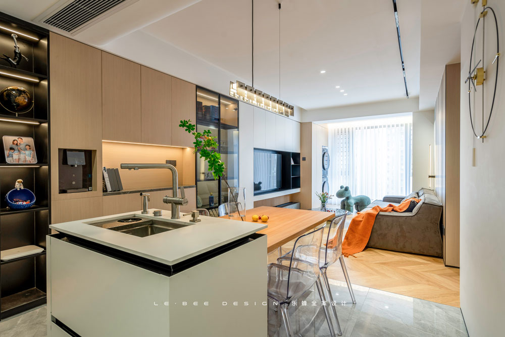 島臺(tái)的水槽功能齊全,抽拉式水龍頭、噴槍、洗杯子的壓槽,哪怕是冰冷的不銹鋼材質(zhì),也能變得體貼入微。巖板臺(tái)面更好打理,也是島臺(tái)的首選材質(zhì)。