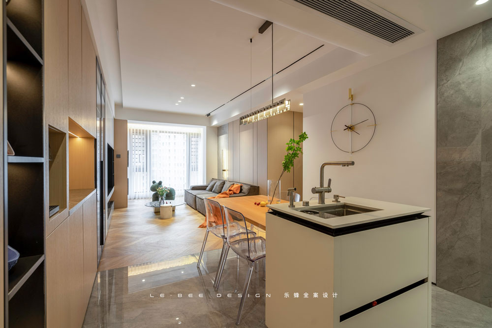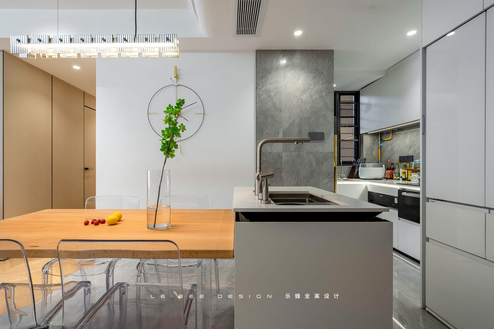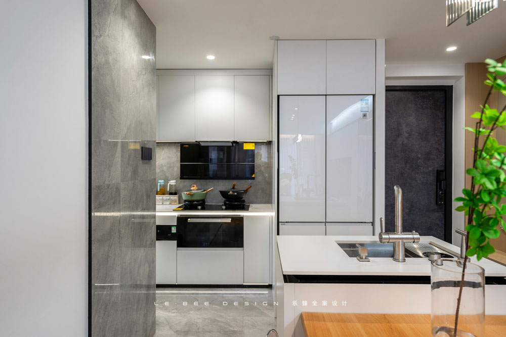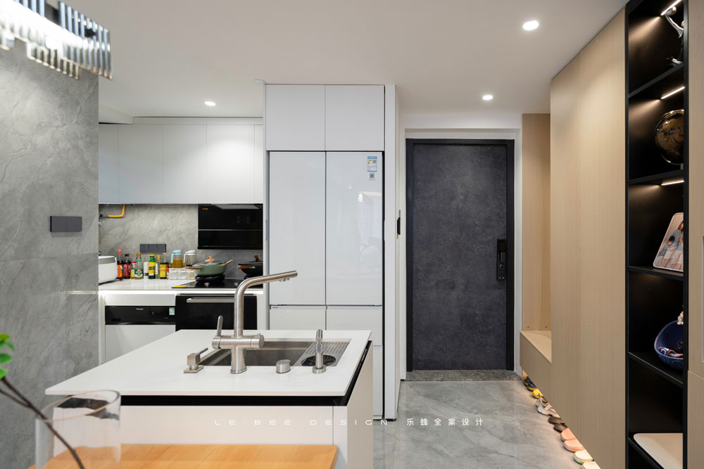 經(jīng)過改造后更加便捷的動(dòng)線是最大的優(yōu)點(diǎn)之一,廚房整體以白色為主,與玄關(guān)公用一片吊頂,同樣采用無主燈設(shè)計(jì),頂面更加簡(jiǎn)潔,減少了頂面不同材質(zhì)碰撞的突兀。