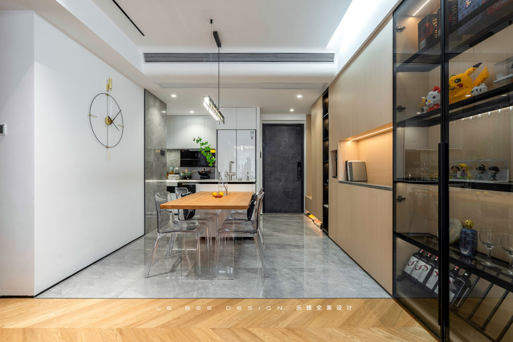 精致、開闊、繽紛,是客廳望向餐廳的第一觀感,得益于廚房墻體的改動(dòng),才使得餐廳擁有了更多的可能。在兩面的墻體中,我們做了極窄的踢腳線設(shè)計(jì),堅(jiān)持精致在家中的每一處貫徹到底。