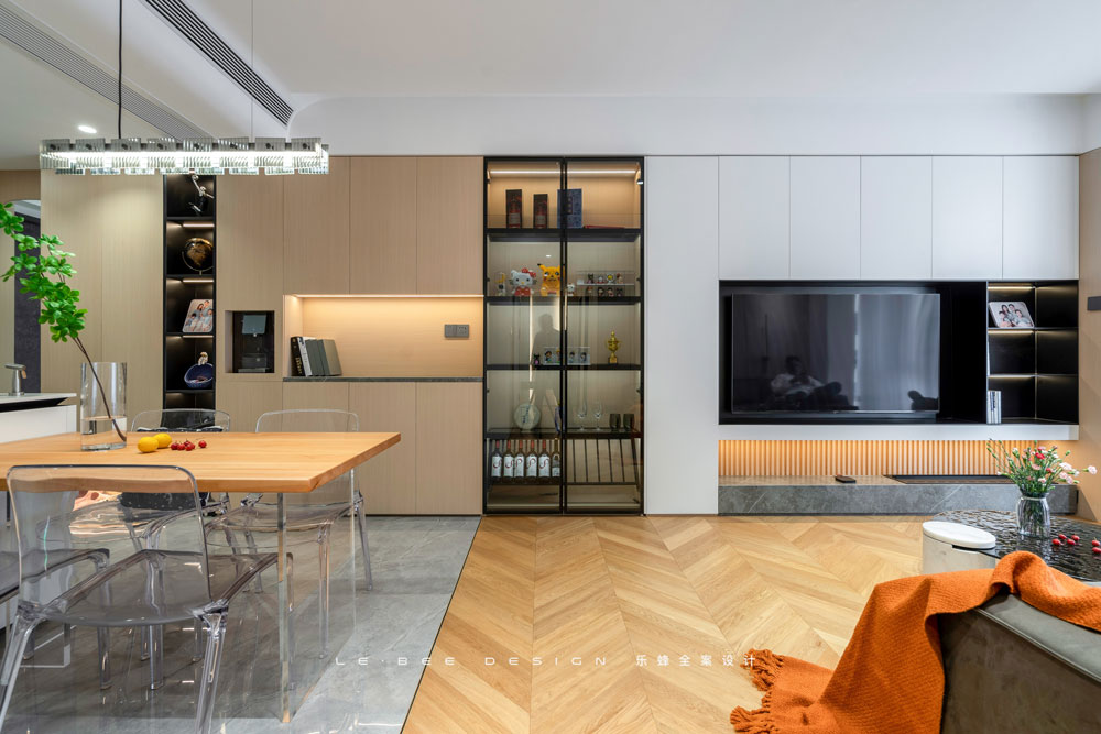 僅僅是觀感舒適已無法滿足大眾對(duì)背景墻的需求,想要懸浮感,想要充足的儲(chǔ)物空間,既有平面的舒展,又有凹凸有致的格局,這就是簡(jiǎn)約派心中完美的電視背景墻吧。不僅如此,為了達(dá)到極致,我們將插座和電線全部隱藏在了背景墻最下方的柜體之中,鏤空的背板以格柵平鋪,不同材質(zhì)的碰撞才能有無限可能。