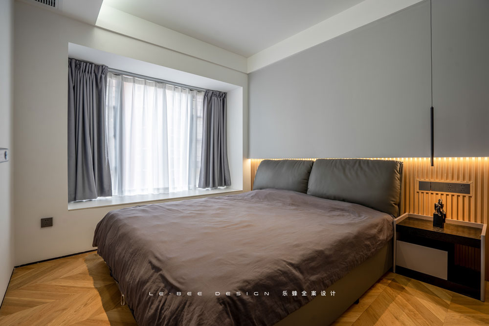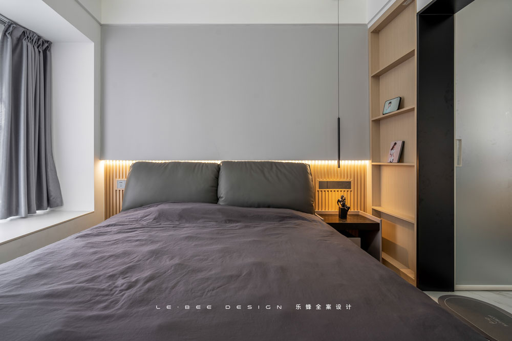 簡(jiǎn)約自帶的高級(jí)感在主臥被很明顯地突顯,莫蘭迪灰作為床頭背景,床頭燈帶一反常態(tài),改為內(nèi)嵌于上半部分的墻體之中,這樣的設(shè)計(jì),既能實(shí)現(xiàn)溫馨氛圍,又能減少因背景板而造成了空間占用,合理的設(shè)計(jì),就是可以滿足心中所想。