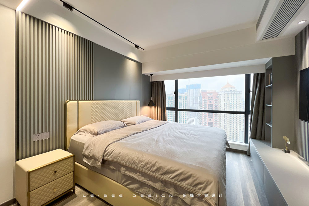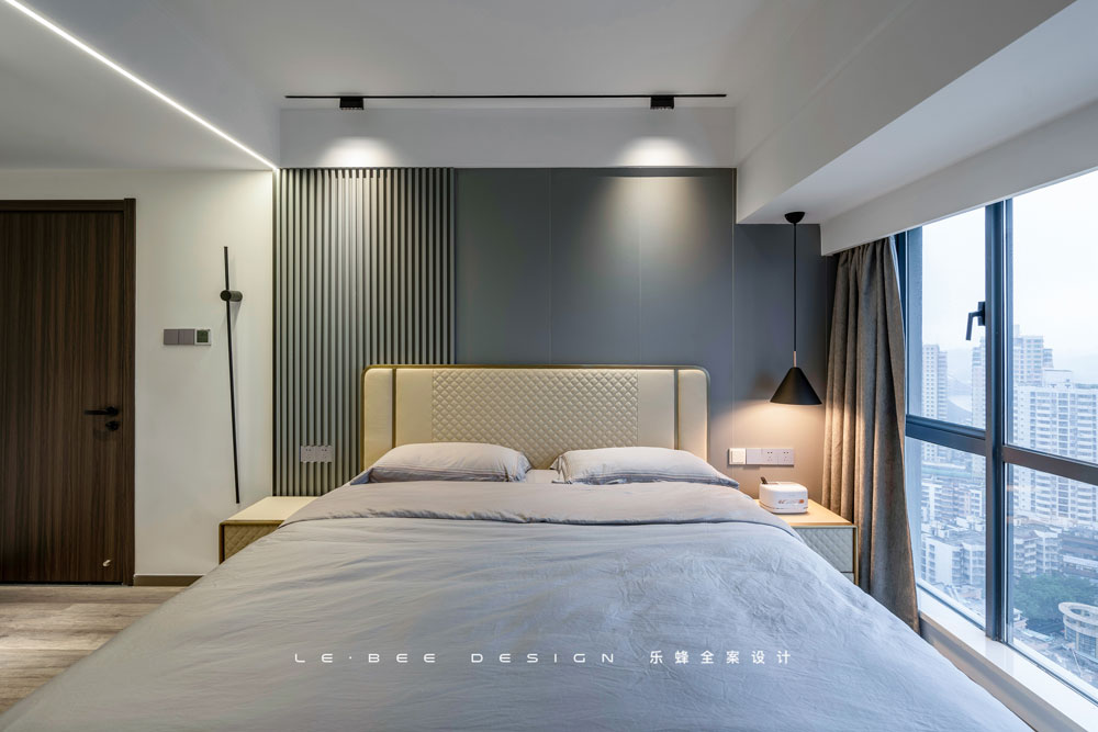 色調不同,風格相近,主臥的設計更為素雅。米色和灰色的碰撞,有種難以名狀的溫柔和克制。室內選用極簡的燈光布局,用線條裝飾頂部,用燈光包裹四周,入睡時能擁有獨特的安全感。