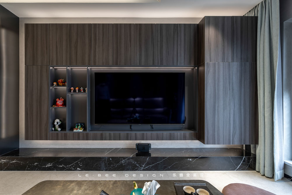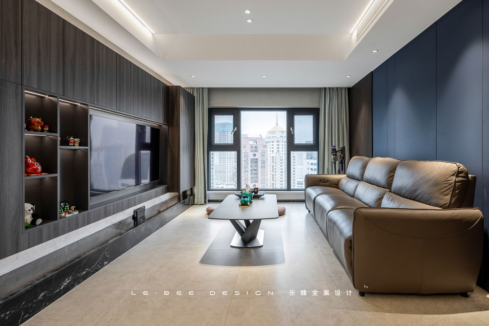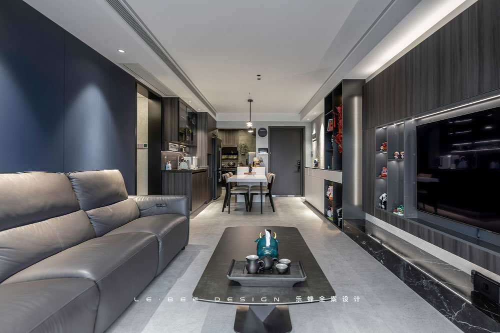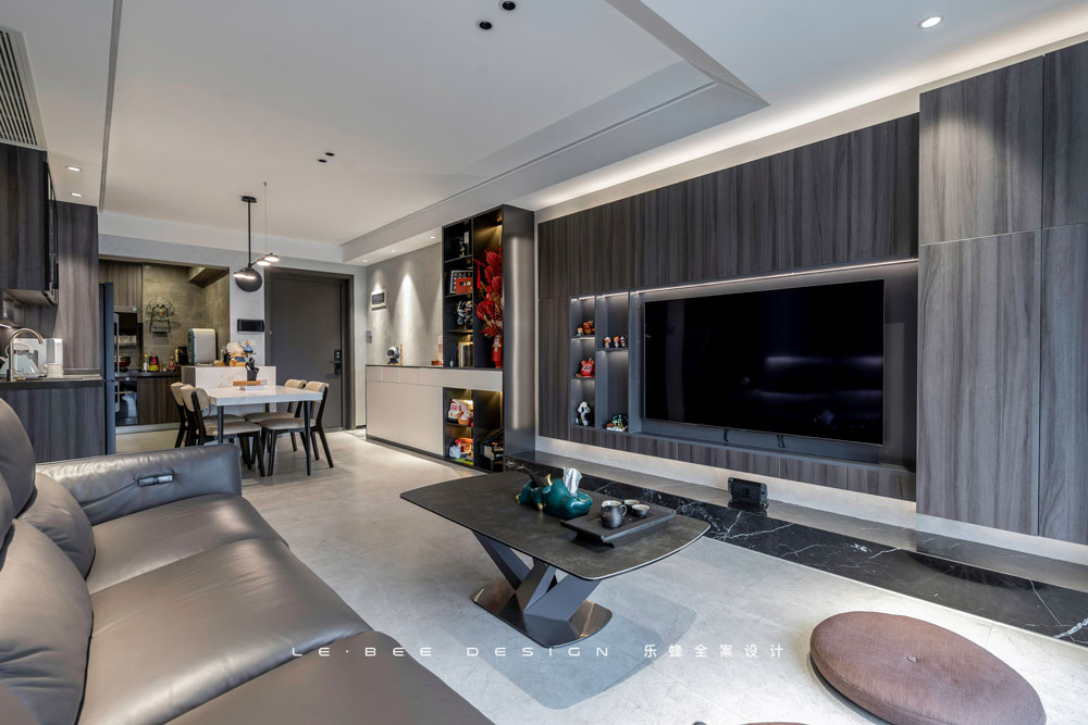 將陽臺納入后,才有了現在一望到底的豎廳格局,不管是景還是光,全都毫無保留收入其中。深色背景和淺色頂面地面,空間張馳有度。越深的底色便有越強的對比度,深色作為沙發和電視背景,人在其中被襯托得格外耀眼。
