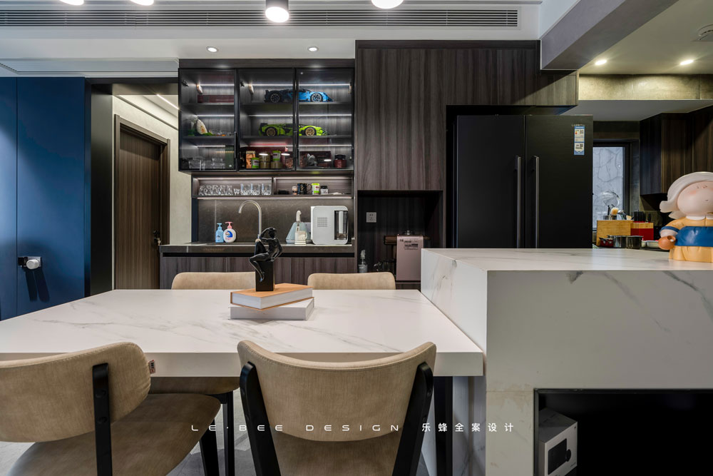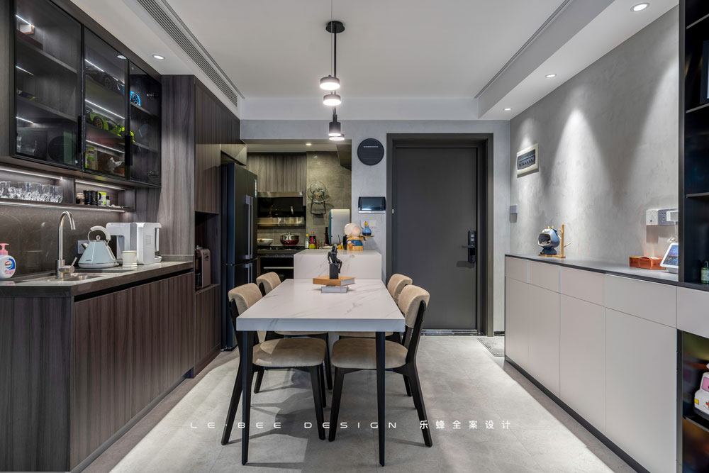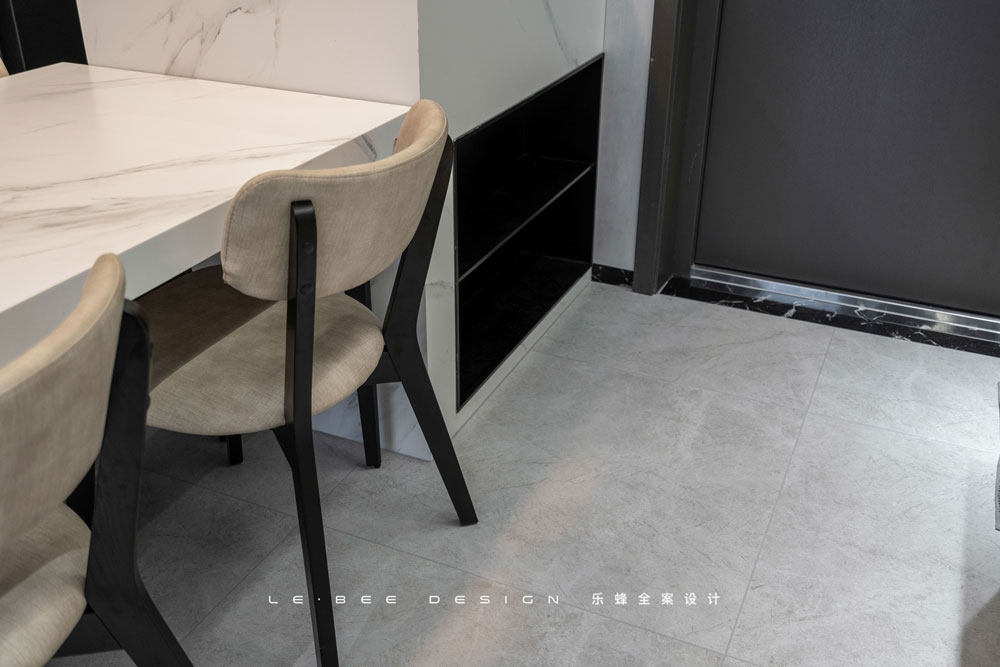 和玄關相對,一黑一白,反差也是樂趣的一種。從全局來看,餐廳主要由餐桌、餐邊柜和島臺組成。黑白經典配色既耐看,又不落俗套。