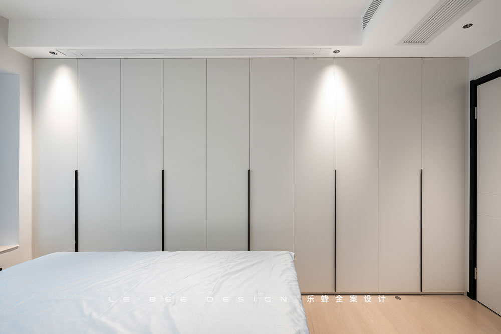 做為單純的睡眠區,床和衣柜的布置就已足夠,背景選擇米黃色乳膠漆,在簡約的同時兼顧美感。