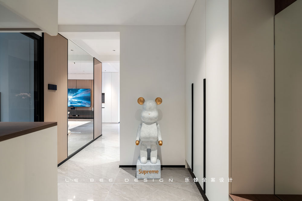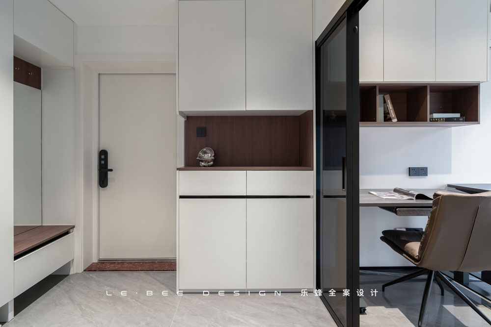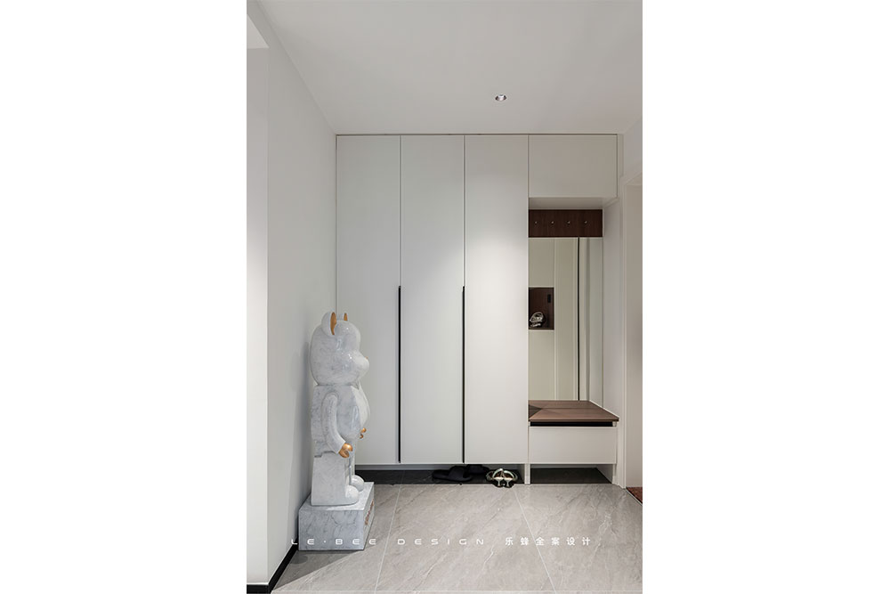 右側一組玄關柜勾畫所有功能,卡座的設計取代單獨換鞋凳,后置全身鏡在出門前方便整理儀容。在細節之處,背板上的掛鉤設計是包包和外套的專屬區,小小的掛鉤,使我們在一回家就卸下一身疲憊,帶著輕松的心情踏入家中。