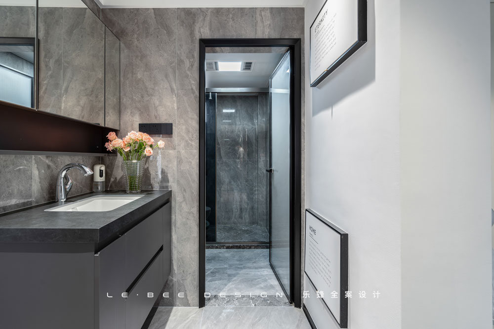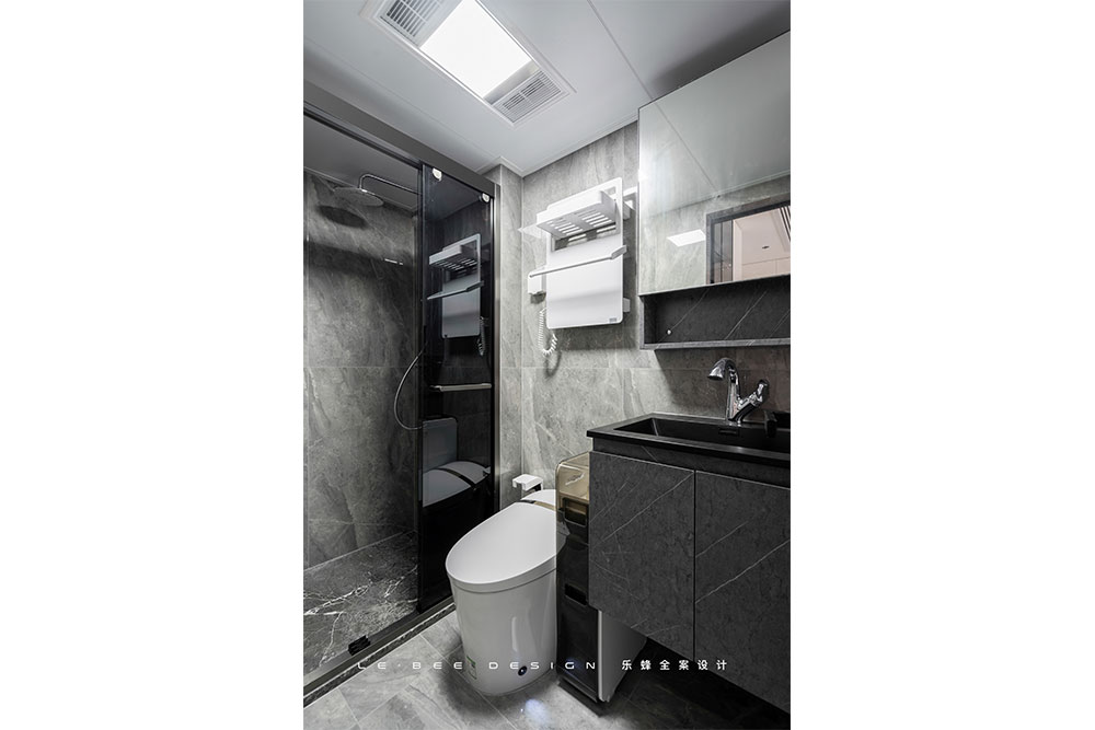 鏡面柜作為衛生間儲物綽綽有余,后方的背景做了簡單裝飾,也是隱藏強弱電箱的小妙招。