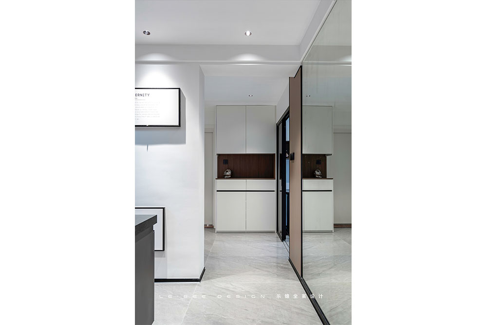 玻璃門隔斷采用極細金屬軌道,穩固和簡約的同時,衛生死角也能盡量避免。