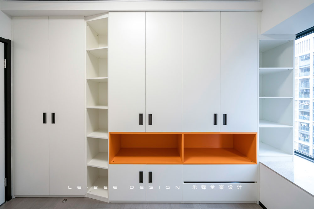 作為兒童房,在收納的設計上更下功夫,陪伴孩子成長的必定會留下足跡,它們也將是孩子最好的回憶。我們利用墻體設計了深度更深的柜體,確保了容量的豐富,配色不再選擇單一白色,而是加入橙色,鮮艷和活力是孩子的特征。展示柜方便孩子擺放心愛的擺件和玩具,靠自己裝飾自己的小天地是每個孩子無法抗拒的事。