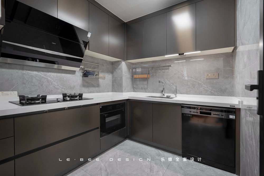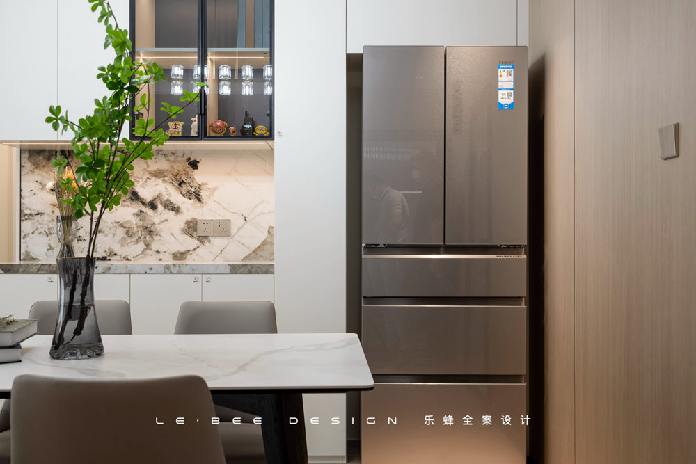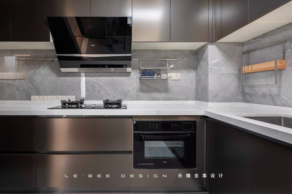 L字型空間布局,擴大廚房利用面積后,廚房操作能滿足多人同時使用。超晶板是櫥柜最高級的材質(zhì)之一,對于廚房的光線能夠進行溫和地反射,材質(zhì)紋理細膩到無可挑剔。