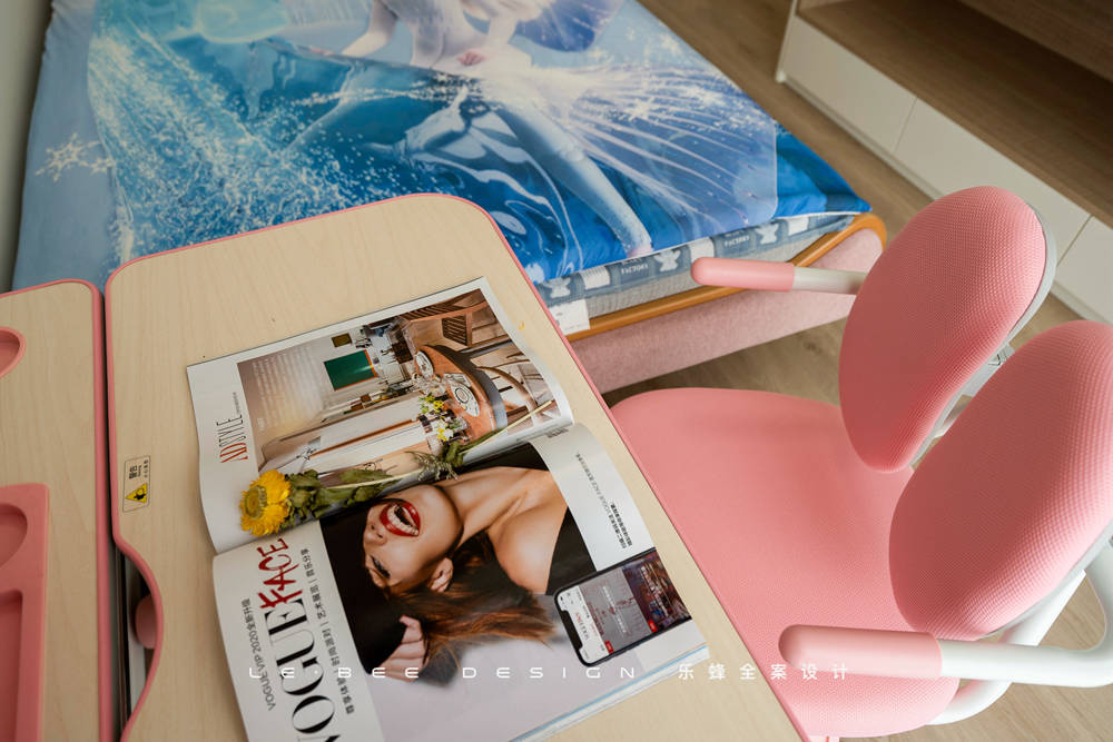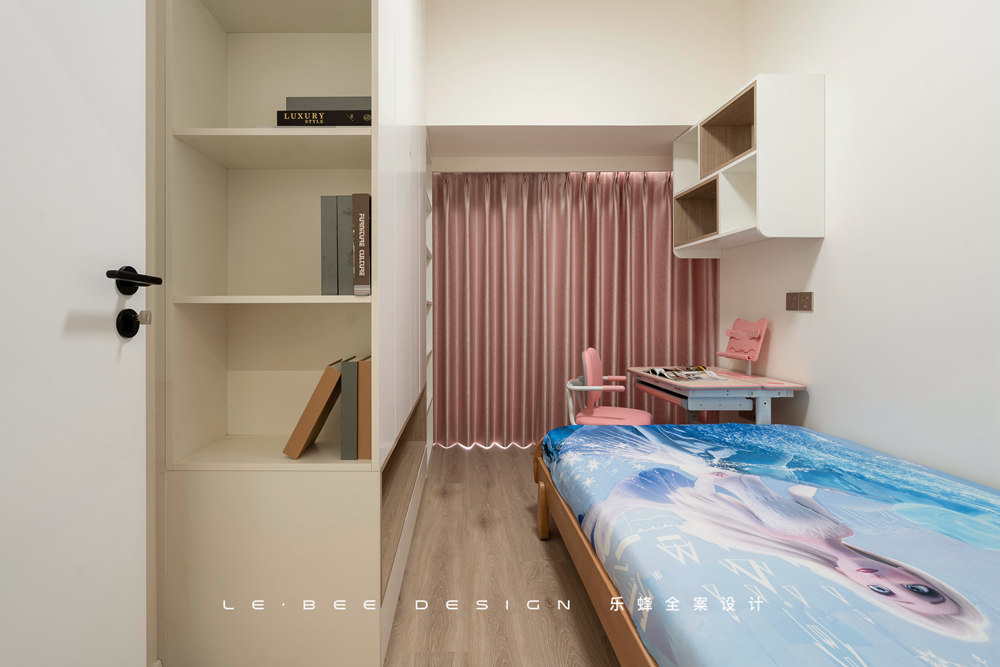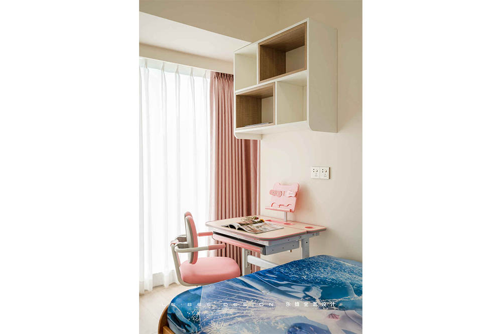 小女孩的房間除了要滿足女孩的美好幻想,足夠的收納空間也必須滿足。床體靠墻擺放,另一面設(shè)計整面墻的柜體,女孩的衣物、玩具、公仔,全部都不在話下。