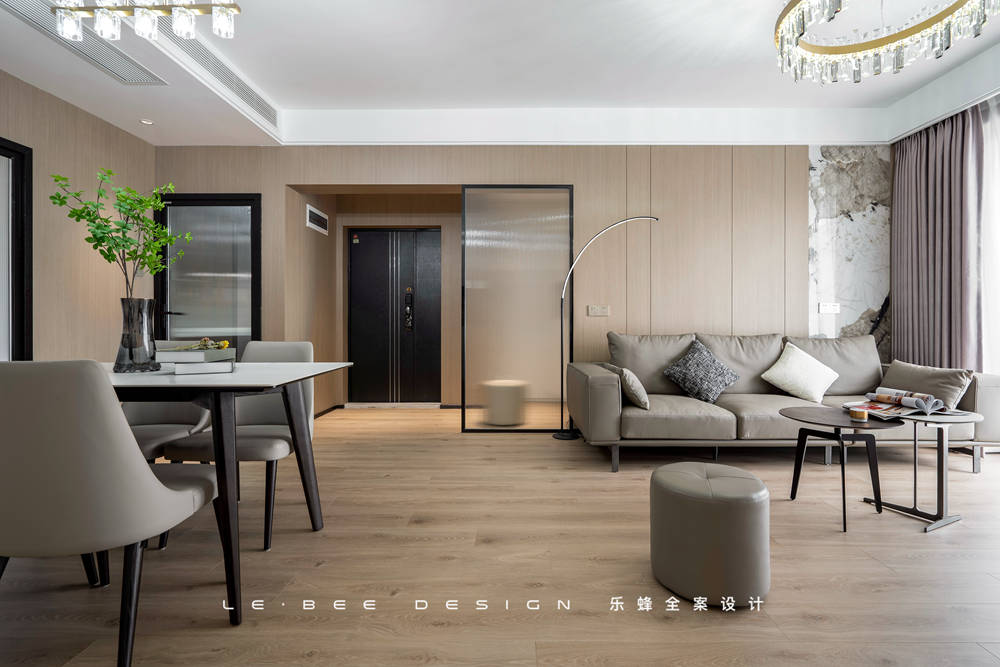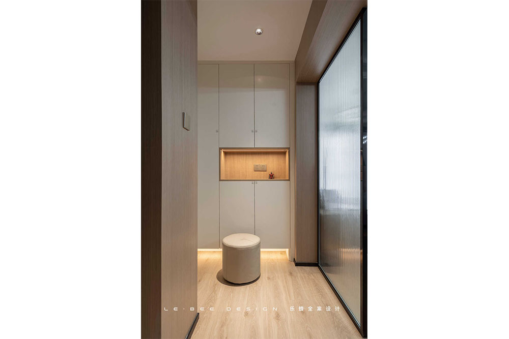 顏色選擇了業(yè)主一家最愛的淺色系,淺色木質(zhì)紋理有金色絲綢質(zhì)感,當(dāng)然功不可沒的是玄關(guān)處的暖色燈光烘托。在吊柜和地軌的兩處燈帶照耀下,玄關(guān)變得暖盈盈的,借此也為整個家的基調(diào)做了鋪墊。