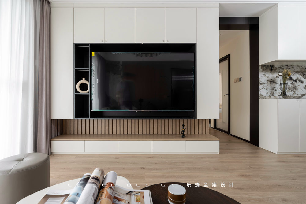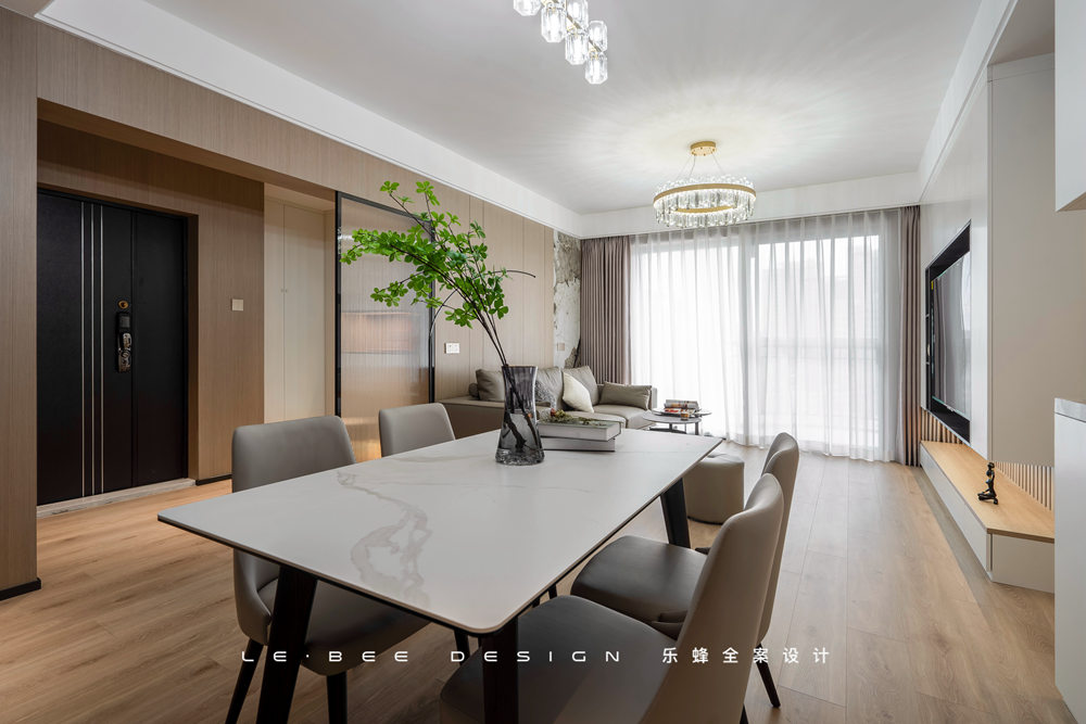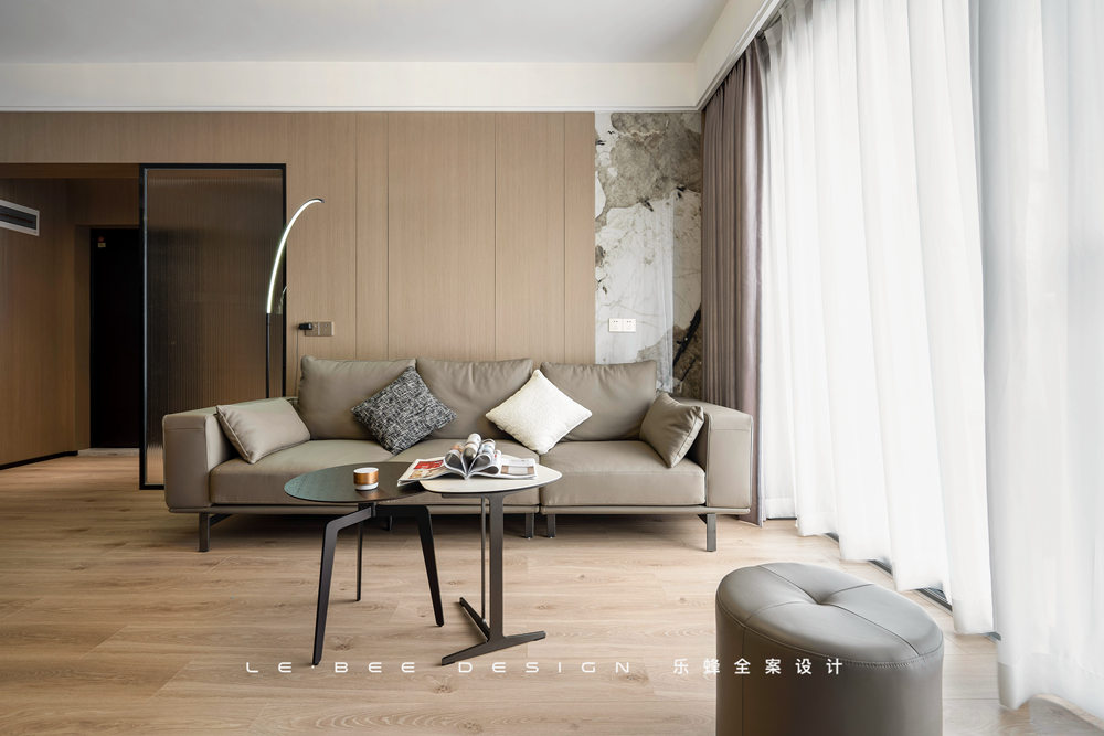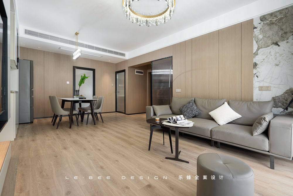 地面選擇暖色地板通鋪,在陽光照耀下反射瑩瑩微光。沙發(fā)背景選擇木飾面板,沒有刻意去掉拼接痕跡,增加了平面的線條和紋路,細小的紋路也能有跌宕的起伏。除此之外,沙發(fā)背景添加了一塊巖板進行拼接,風(fēng)格迥異的材質(zhì)之間也能產(chǎn)生和諧之美。