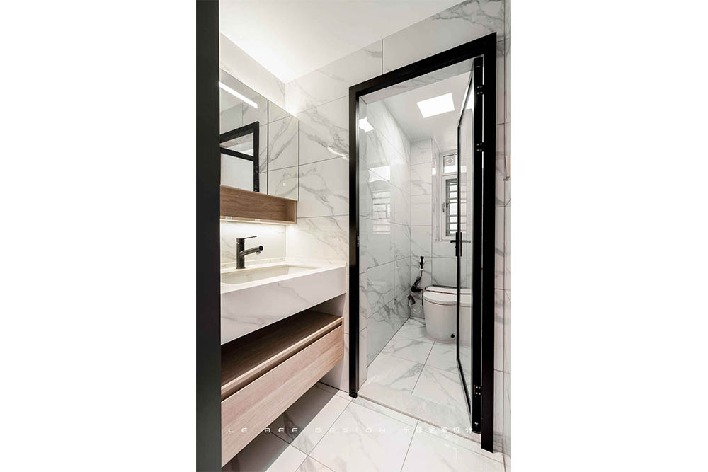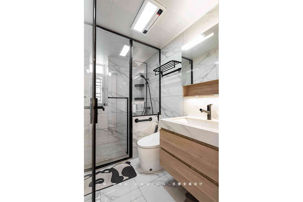 原始衛(wèi)生間格局沒有經(jīng)過改動,干濕分離,為了減少空間的壓抑感,淋浴隔斷只采取了半墻為實體墻,其余全部為玻璃隔斷,空間的通透感達到最佳。