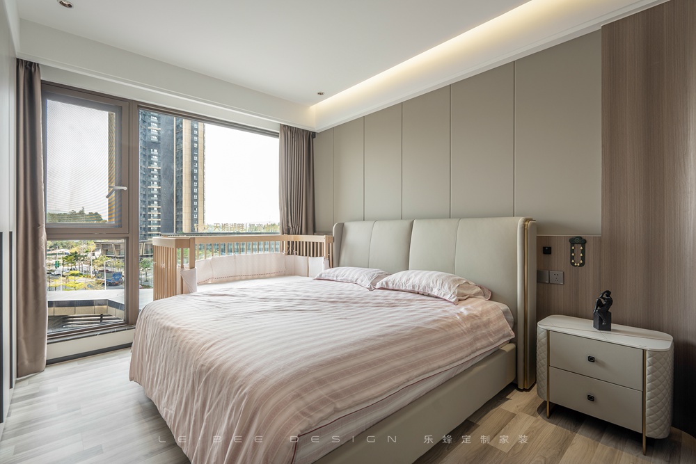 主臥保持了屋內的整體性,同樣運用了大量的木飾面和原木元素,床頭選擇利用木飾面和護墻板拼接的方式,將主臥隔斷、墻裙和床頭背景進行連接,過渡自然不生硬。業主家中的寶寶還處在嬰兒階段,因此將嬰兒床靠在了雙人床邊,方便業主照顧孩子。