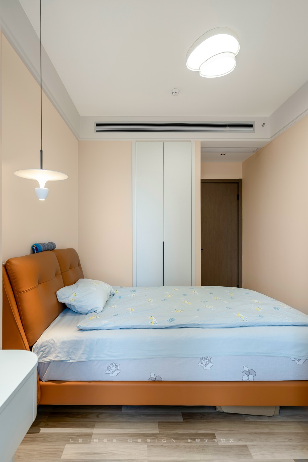 次臥選擇了更加活潑明亮的配色,墻面的顏色飽和度更高,打造出十分青春活力的氛圍。靠窗的位置定制了一面書桌和書架,橙白的配色有利于激發大腦的活力,孩子學習的思維能夠更加敏捷。