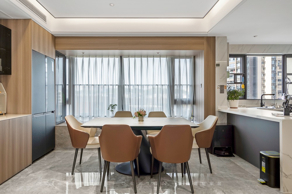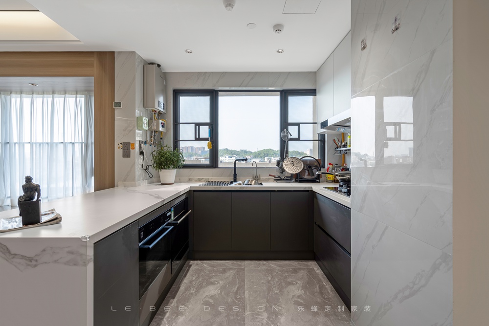 廚房設計為U型布局,一側功能設計為島臺的形式和餐廳相連,加強了餐廳和廚房的溝通,家人之間在不同的空間也能夠相互陪伴。