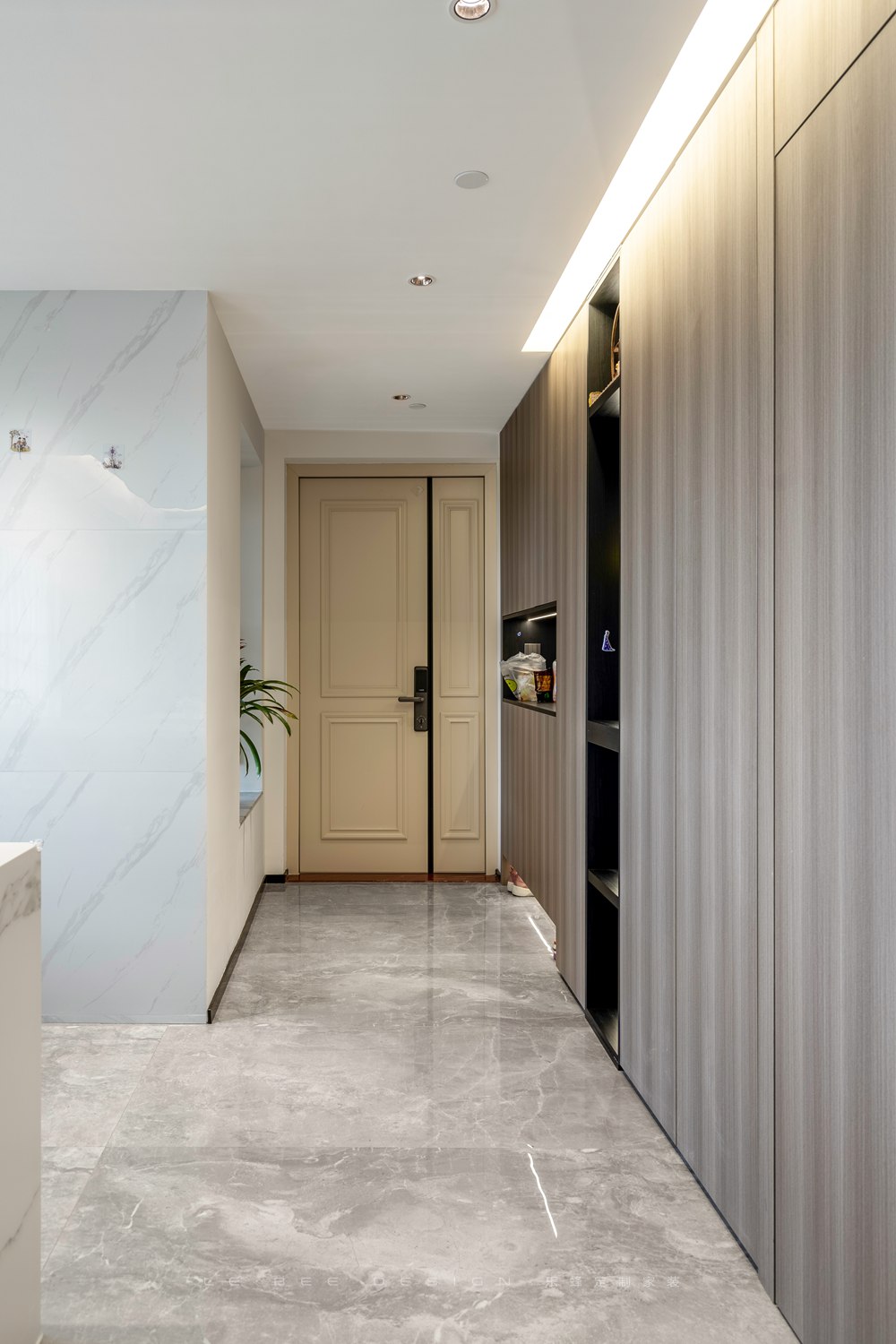靠墻設計玄關柜,玄關柜面 和墻面裝飾選擇同一種材質——木飾面,這樣的設計使得屋內的整體性得到提高。在玄關柜的分割處,設計了一組格間展示柜,作為功能和空間的分割作用。木飾面板中設計了次臥的隱形門,不破壞墻面和柜體的整體性。