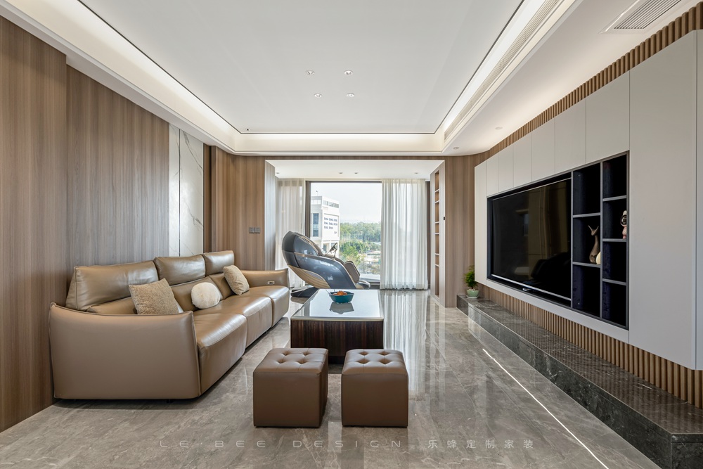 客廳選擇了素雅的低飽和色系,以咖色為主,線條的打造都十分干凈利落。客廳中運用了大量的木飾面進行裝飾,自然材質的紋理既柔和又高級。
