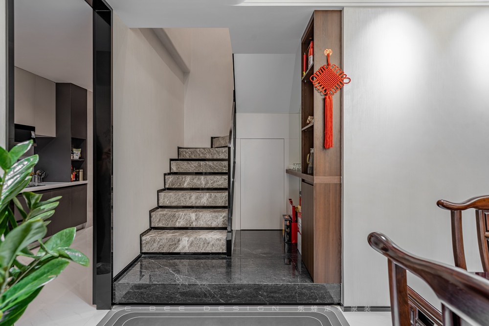 將樓梯改到餐廳廚房處后,樓梯的面積縮小了,我們將樓梯是合計為轉角樓梯,能夠最大程度減少樓梯的占地面積。樓梯下方的設計以收納為主,設計了小型儲物間和收納柜,解決家中的收納需求。