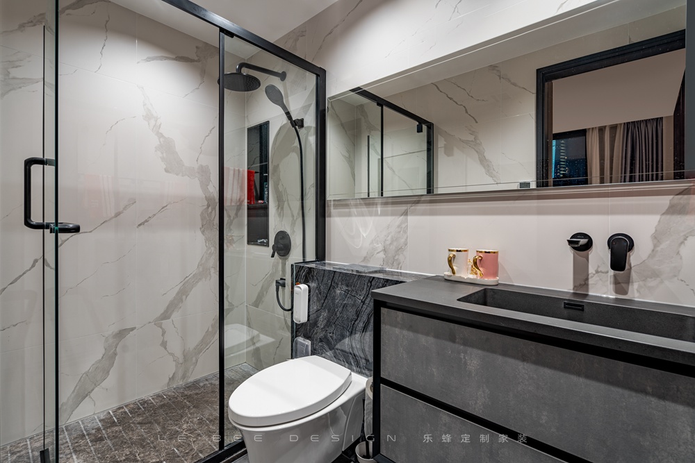 在現代家庭的衛生間中,干濕分離已是基本要求。為了最大程度減少衛生間的清潔壓力,我們設計了掛壁馬桶和墻排浴室柜,地面不留衛生死角。洗手臺臺面延伸至馬桶上方,增加置物空間。淋浴區選擇設計壁龕,節省內部空間。