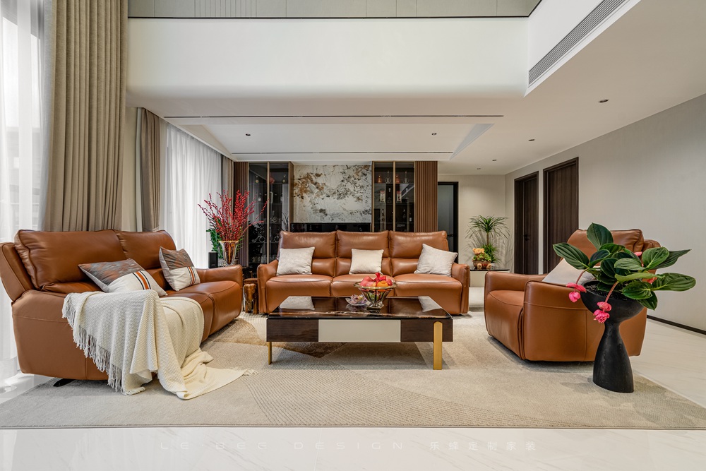 一樓客廳擁有五米挑高,我們在設計中盡可能保留了客廳的氣勢,選擇了能夠凸顯自然紋理的材質進行設計。電視背景運用木格柵和巖板打造,極簡的設計能最能夠發揮其優勢。二層背景設計為硬包材質,淺色不會帶來壓抑的效果。