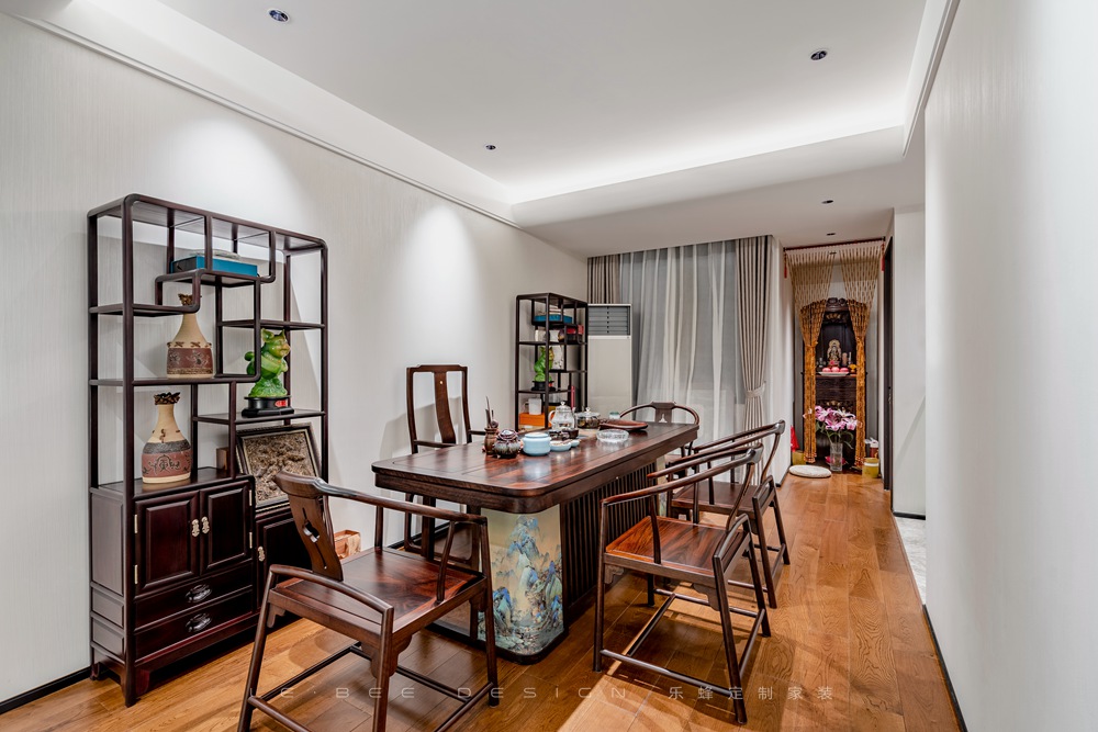 家中特地留出一個房間作為茶室使用,原因是業主平日有 喝茶的喜好,喝茶除了可以作為一項愛好外,還能夠修養身心。茶室內擺放了木質茶桌椅,符合茶室應有的風格和主題。