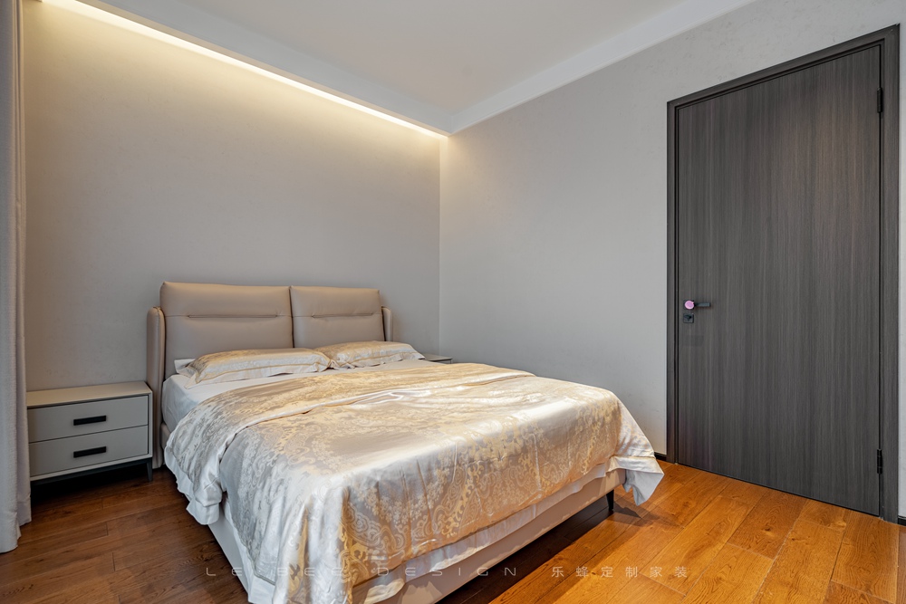 次臥選擇了精簡的設計,以保證最佳的實用性為主。床頭設計了燈帶,為睡眠區打造溫馨氛圍。
