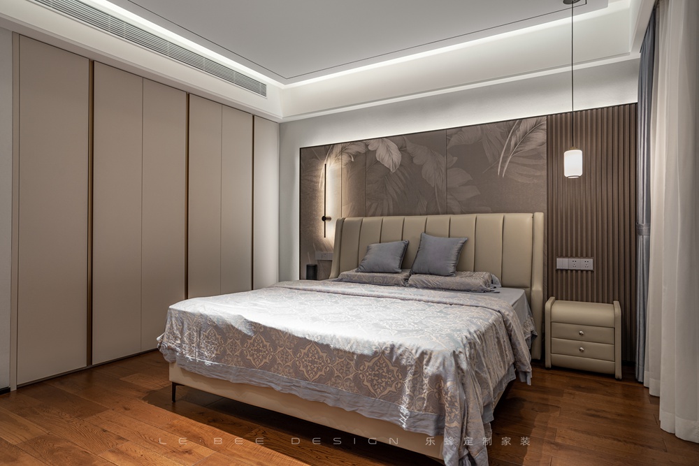 主臥選擇了素雅的米白和淺灰的配色,床頭設計了護墻板和木格柵拼接,營造出一絲古典韻味。床尾和床邊設計了收納柜,床尾的矮柜可用作電視柜使用。