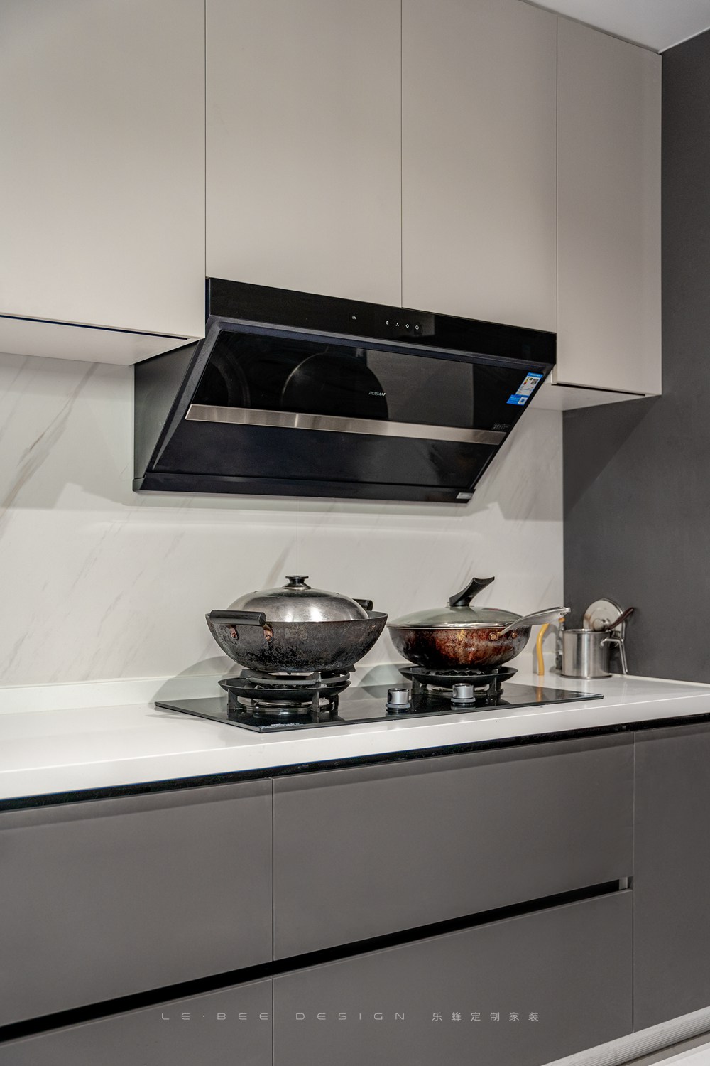 櫥柜選擇了灰白配色,簡約的設計風格之下,廚房顯得簡潔高級。櫥柜的設計采用了最前線的隱形柜門設計,使用起來輕松便利。