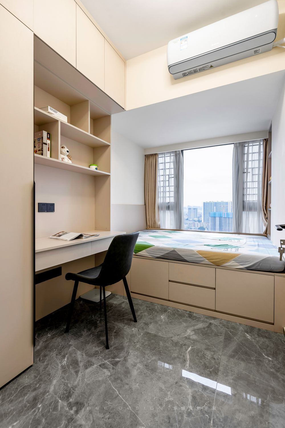 兒童房設計為榻榻米的形式,一次性解決睡眠、收納和書桌需求。房內選擇溫馨柔和的米色進行設計,睡眠區充分利用了飄窗,節省了兒童房內部的空間。
