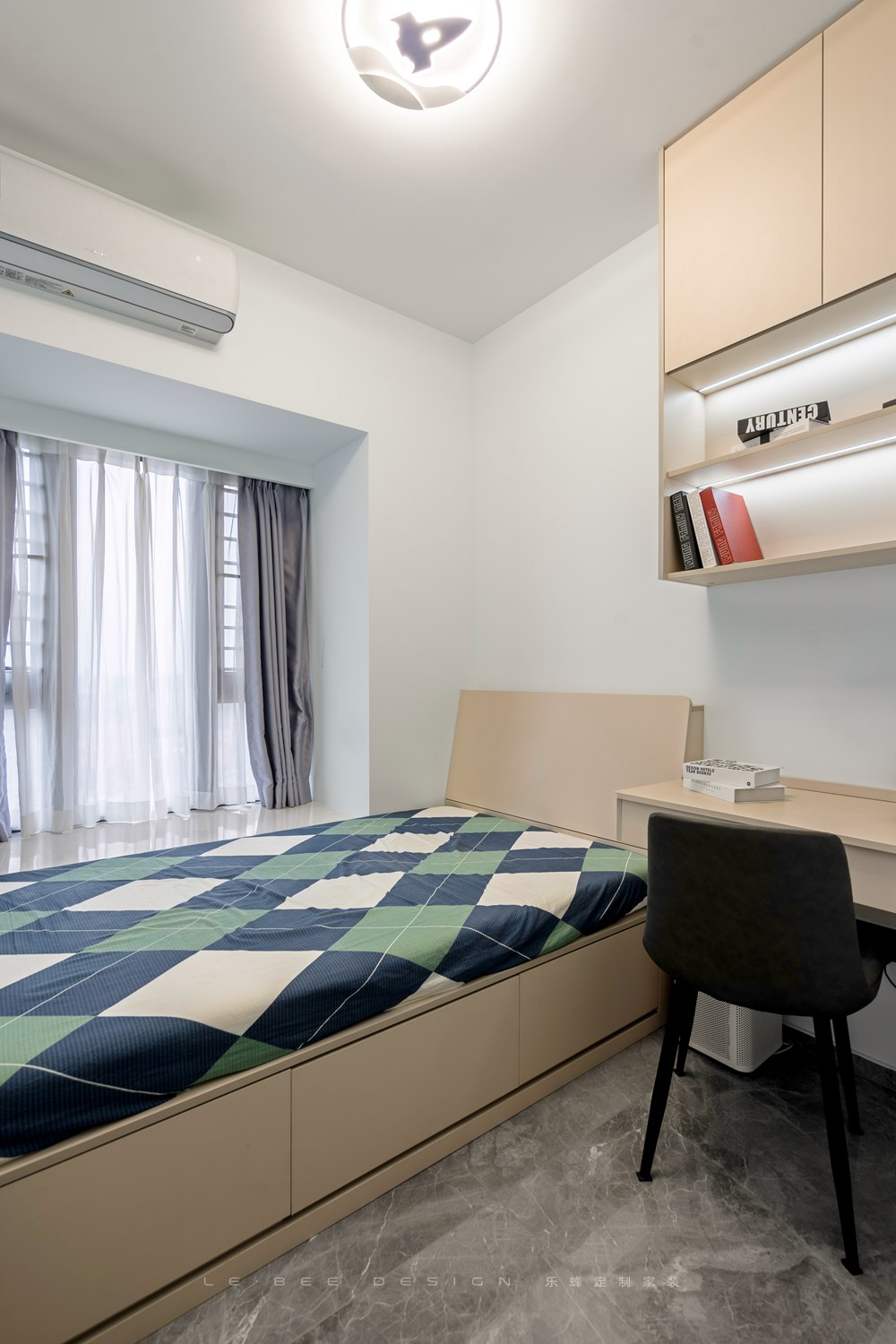 次臥設計為客房,因此布局簡單,設計了睡眠區、辦公區和一部分的收納,對于不常住的家人朋友來說,這樣的布局已經足夠了。