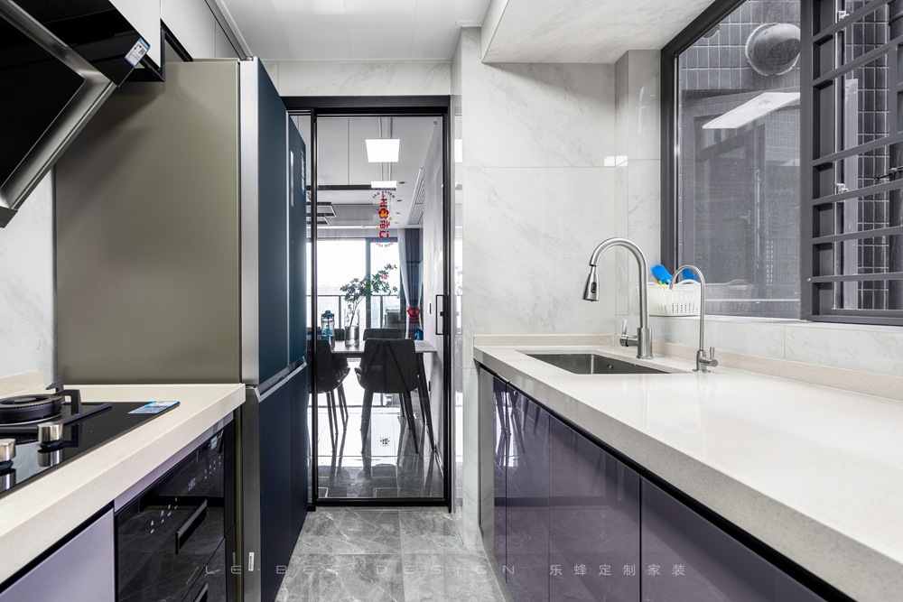 廚房巧妙利用空間格局設計了U字型操作臺,最大程度利用了廚房空間。利用紫白配色打造高貴低調的風格,舒心的莫蘭迪色系搭配,讓下廚都變成一種享受。櫥柜的設計留有了冰箱的位置,冰箱內嵌,并不顯突兀,洗菜做飯也更加便利,不需要占據餐廳的空間。