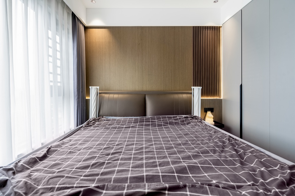 主臥的設計更加素雅,利用了淺灰色和原木色打造成熟和高級感。床頭設計了木飾面和木格柵的背景,簡約卻不單調,除此之外也設計了墻裙,將燈帶內嵌其中,給主臥營造溫馨的氛圍感和安全感。