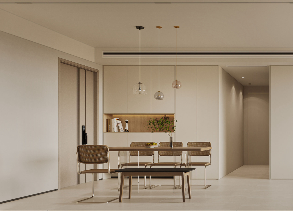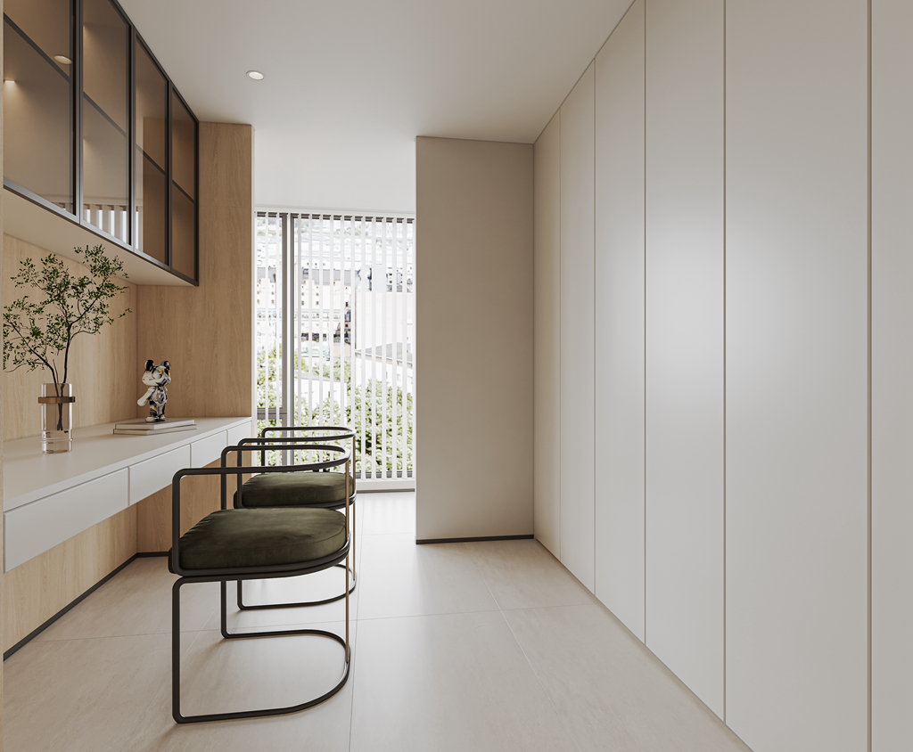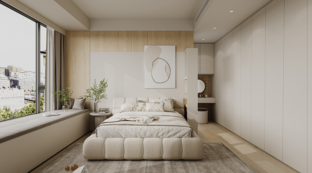 在現(xiàn)代簡(jiǎn)約風(fēng)的設(shè)計(jì)上,美學(xué)原則是關(guān)鍵。室內(nèi)色調(diào)通常選擇白色、灰色等素雅色系作為基調(diào),以增加空間明亮感和視覺延伸感,同時(shí)也提供了更多的創(chuàng)造性發(fā)揮空間。本案這對(duì)夫妻業(yè)主對(duì)簡(jiǎn)約的裝修風(fēng)格情有獨(dú)鐘,他們希望家中的每個(gè)角落都洋溢著溫馨與簡(jiǎn)約的氛圍。為了滿足他們對(duì)收納空間的需求,同時(shí)避免臥室中,床與主衛(wèi)相對(duì)的尷尬布局,設(shè)計(jì)師決定以現(xiàn)代簡(jiǎn)約風(fēng)為主題,充分利用空間布局和細(xì)節(jié)設(shè)計(jì)來實(shí)現(xiàn)業(yè)主的期望。