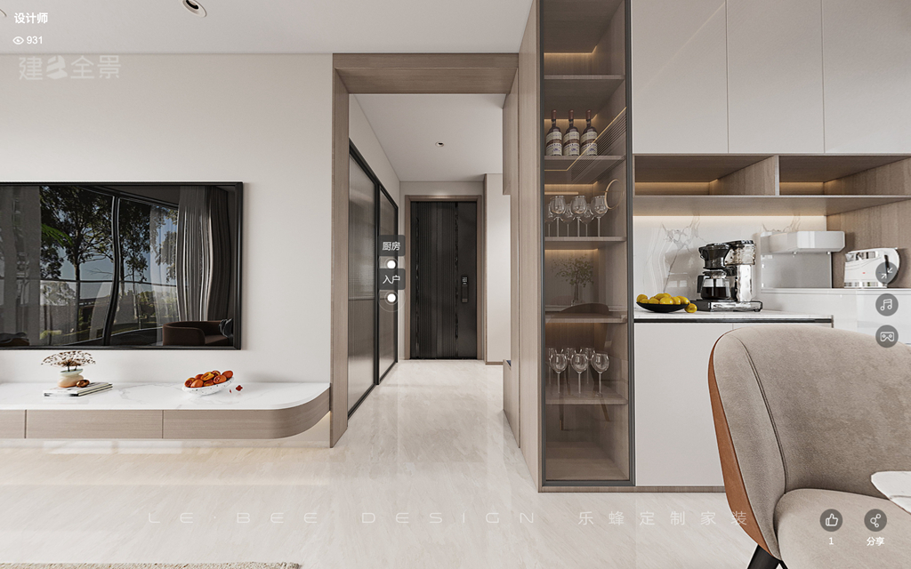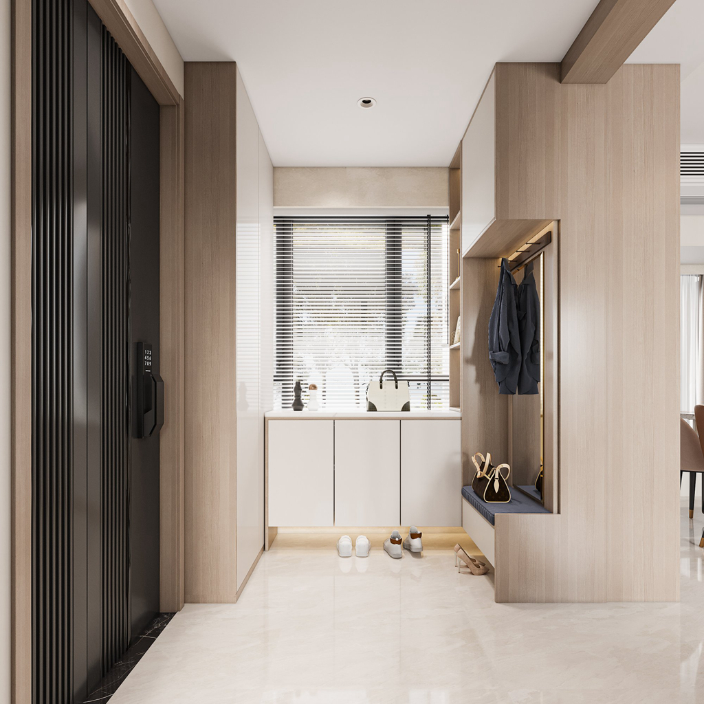 對于一個戶型和家庭來說,玄關不僅僅是實用性,還要考慮美觀和隱私感。在這里,玄關設計更注重業主的實用性,包括懸空鞋柜、鏡面、掛外套的凹槽和柜子。同時,原木元素的運用也增加了整體的美感。