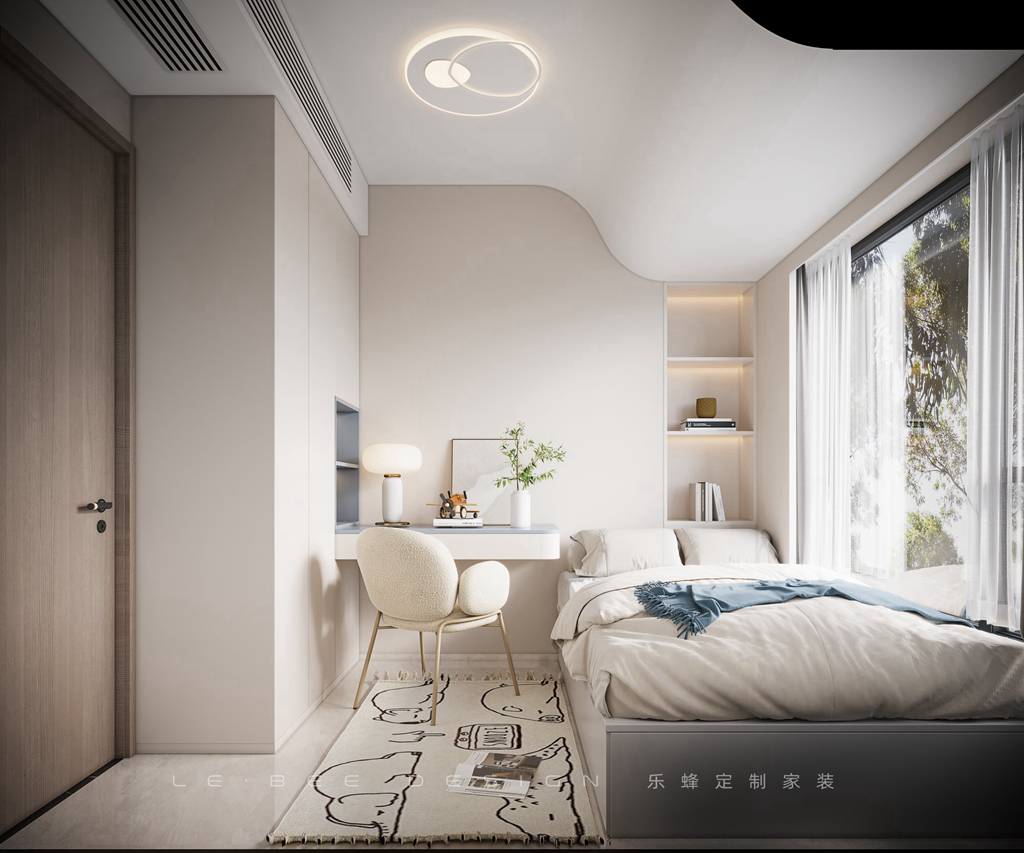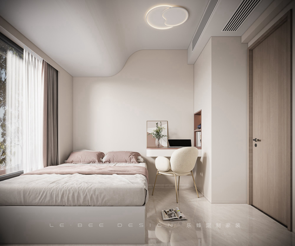 女孩房需要溫馨和治愈的感覺。同樣采用了弧型頂和主燈設計,但帶有一種不同的氛圍,略微加入了粉色的元素。白色、榻榻米床、學習區、綠植和收納衣柜等元素被用來打造更柔和的氛圍,滿足女孩的需求。