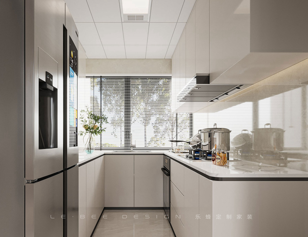 廚房幾乎是每個家庭必備的區域,需要集儲物、烹飪、洗滌和切割等功能于一體。在這里,設計師選擇了U形廚房,以統一和簡潔的色彩為主。墻面磚的選擇易于清潔油污,并且光線充足,讓廚房更加明亮。