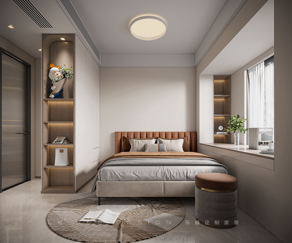 臥室是休息的場所,必須要舒適并且具有隱私性,同時還要有實用的收納功能。在這里,我們選擇了暖管主燈、燈帶和原木等元素來打造舒適的環境。