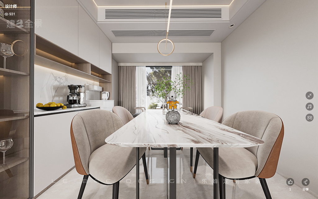餐廳是就餐的必須場所,要兼顧舒適性、方便性和實用簡約。原木餐邊柜、簡約反彈柜門、透明裝飾柜、咖啡機、智能燒水機、綠植以及窗邊的飲茶區等元素都被充分考慮到。這些設計不僅提升了整個餐廳的實用性,還為就餐增添了一些情趣。