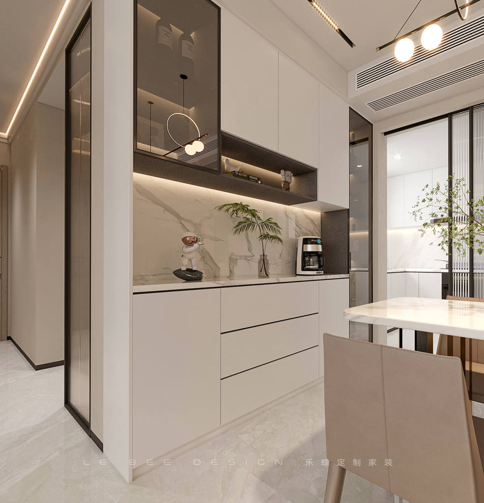 設計師根據業主的需求,選擇了整體的暖白色調,并添加了護墻板和巖板的點綴,使整個空間散發出溫馨的氛圍。