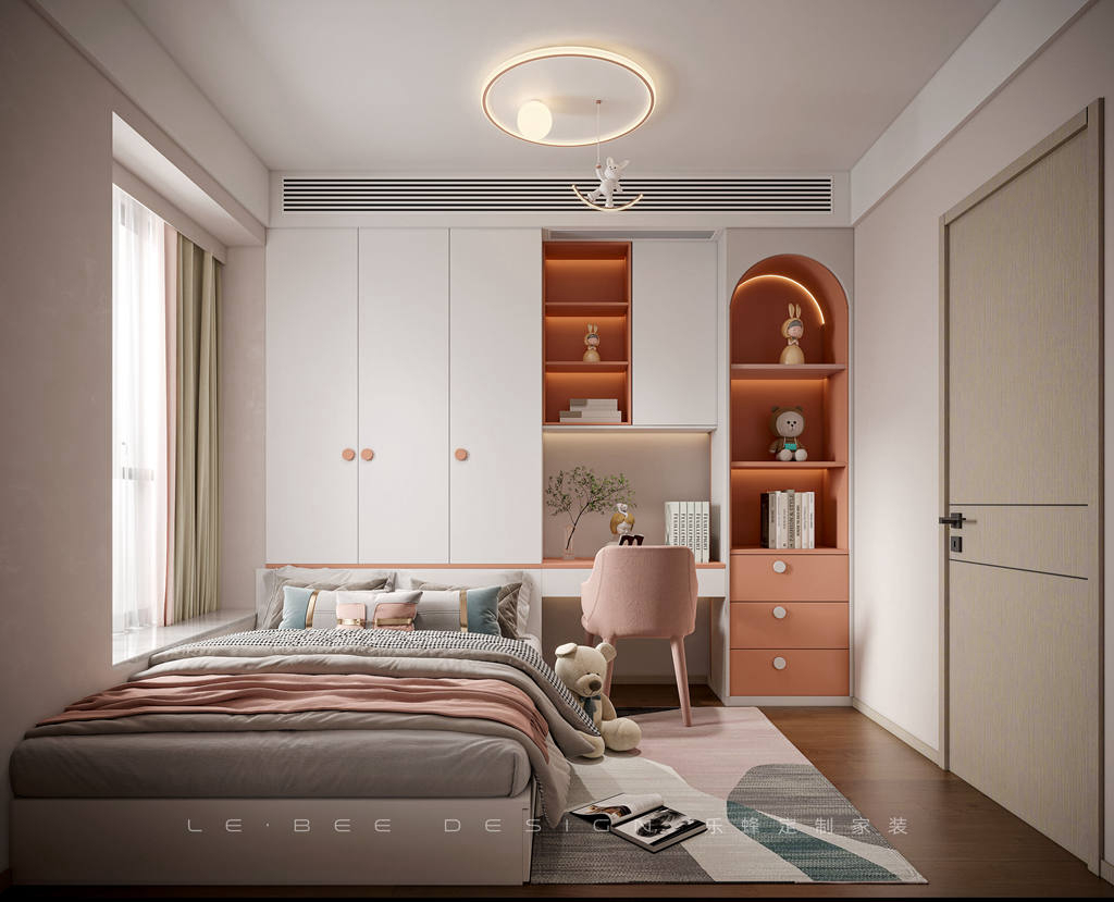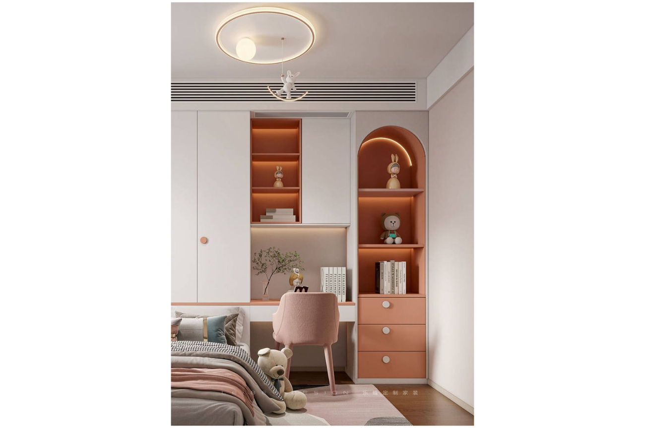 對于小女孩的房間,設計師運用了淡淡的粉色和橘紅色系,使房間充滿了少女感,溫馨而自然。同時,收納和學習一體化的線條美感也在這里得到展現。