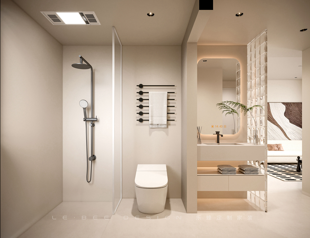 懸空洗漱臺和綠植的點綴,將整個空間裝點得清新自然。鏡面暖光燈照亮著次衛的每一個角落,提供舒適的洗滌體驗。