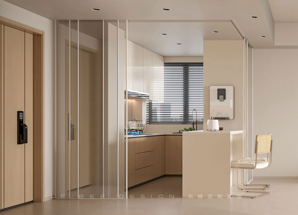 進入廚房餐廳,您會發現這里擁有一個空間感十足的設計。透明的推拉門可以自由開放和封閉。整個空間以原木和奶油色為主,讓您感受到自然與溫馨的共鳴。