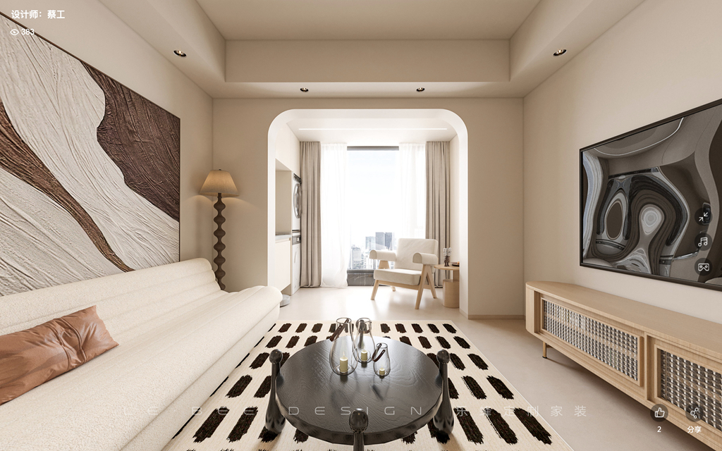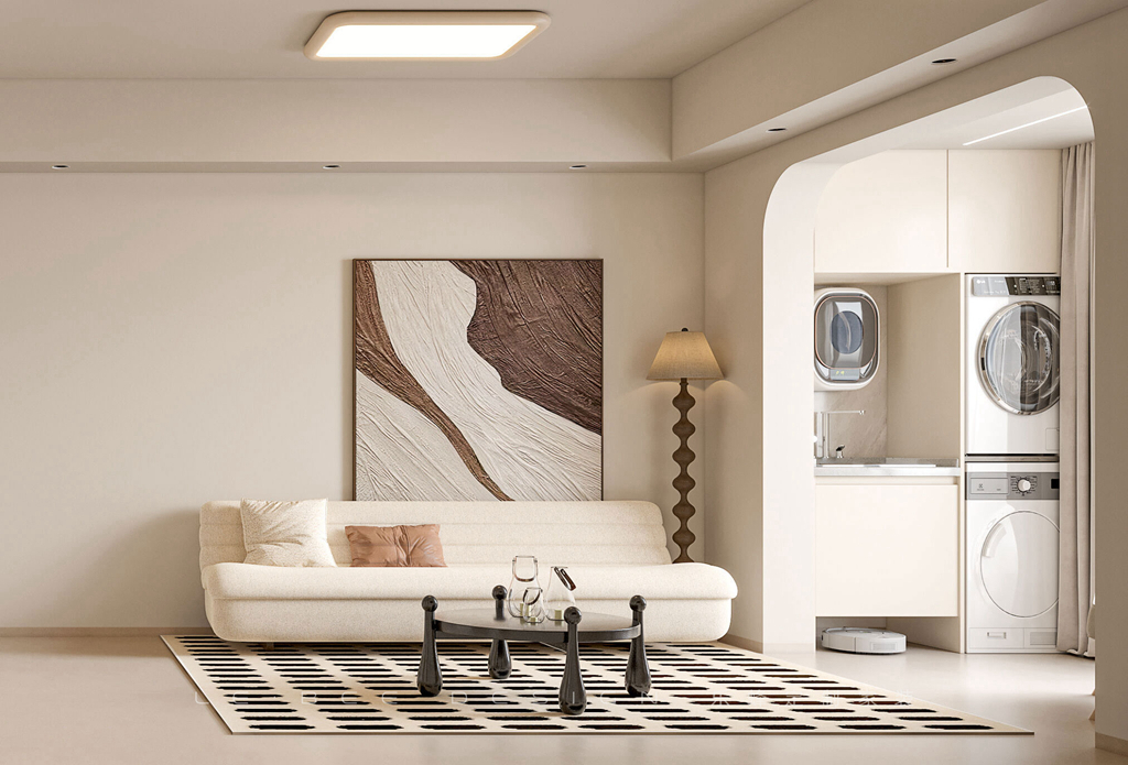 沙發背景掛著一幅精美的白色掛畫,將空間裝點得生動而雅致。奶白色的沙發將整個裝修與柔軟、溫馨相結合,而沙發旁的暖光落地燈為房間增添了一絲靈動。