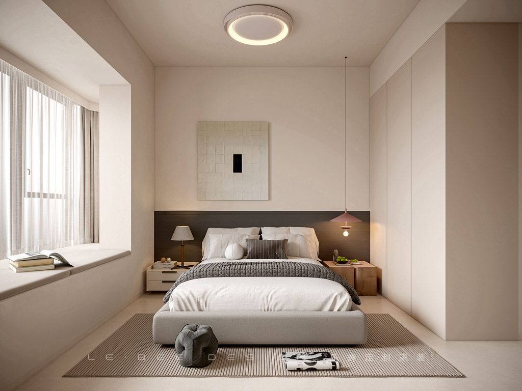 主臥室是整個裝修風格的重要節點。主燈散發著溫暖的光芒,使整個房間充滿柔和的氛圍。
