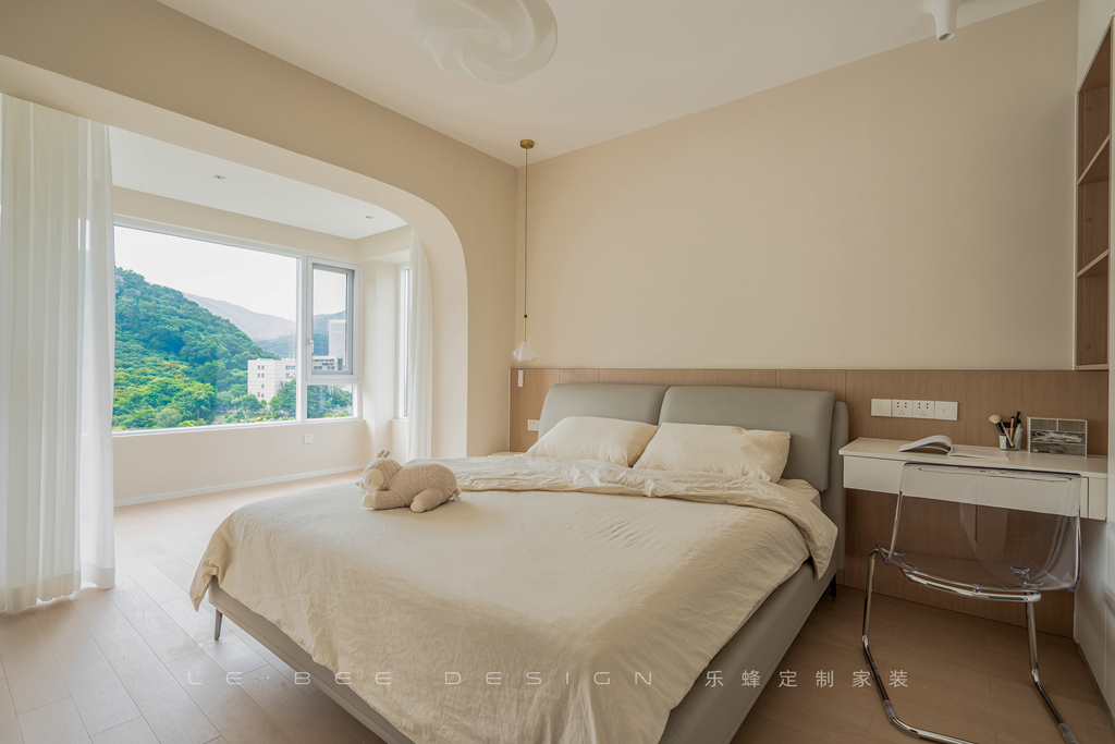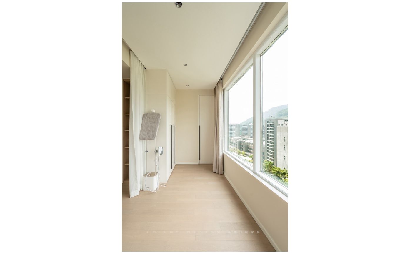 與陽(yáng)臺(tái)區(qū)分開(kāi)的設(shè)計(jì)給主臥帶來(lái)了一個(gè)超大的觀賞陽(yáng)臺(tái),寬敞明亮的大面窗戶讓陽(yáng)光充滿整個(gè)房間。弧型的隔斷和夢(mèng)幻的簾子營(yíng)造出一種浪漫的氛圍,同時(shí)在陽(yáng)臺(tái)上設(shè)計(jì)的衣柜使臥室更加整潔簡(jiǎn)約,充分利用了空間。通往主衛(wèi)的門(mén)兩側(cè)設(shè)計(jì)的隱形嵌入式衣柜簡(jiǎn)潔實(shí)用,就像是一個(gè)安靜的小角落,既方便了衣物的放置,又增加了空間的美觀度。