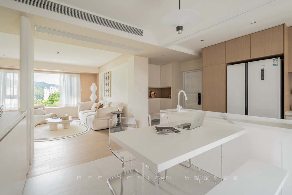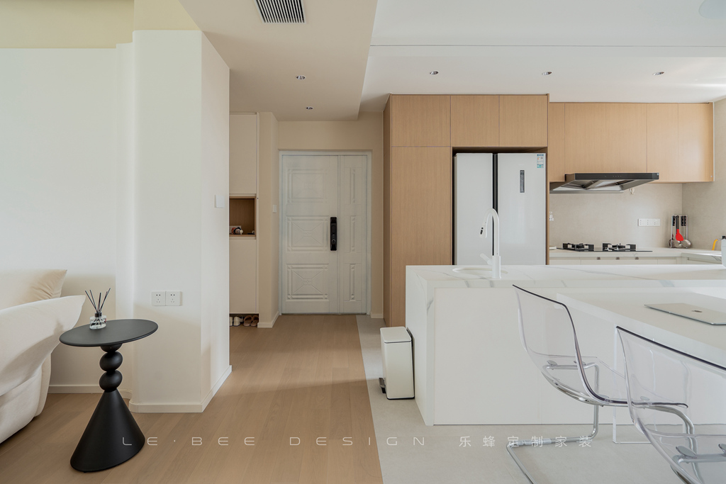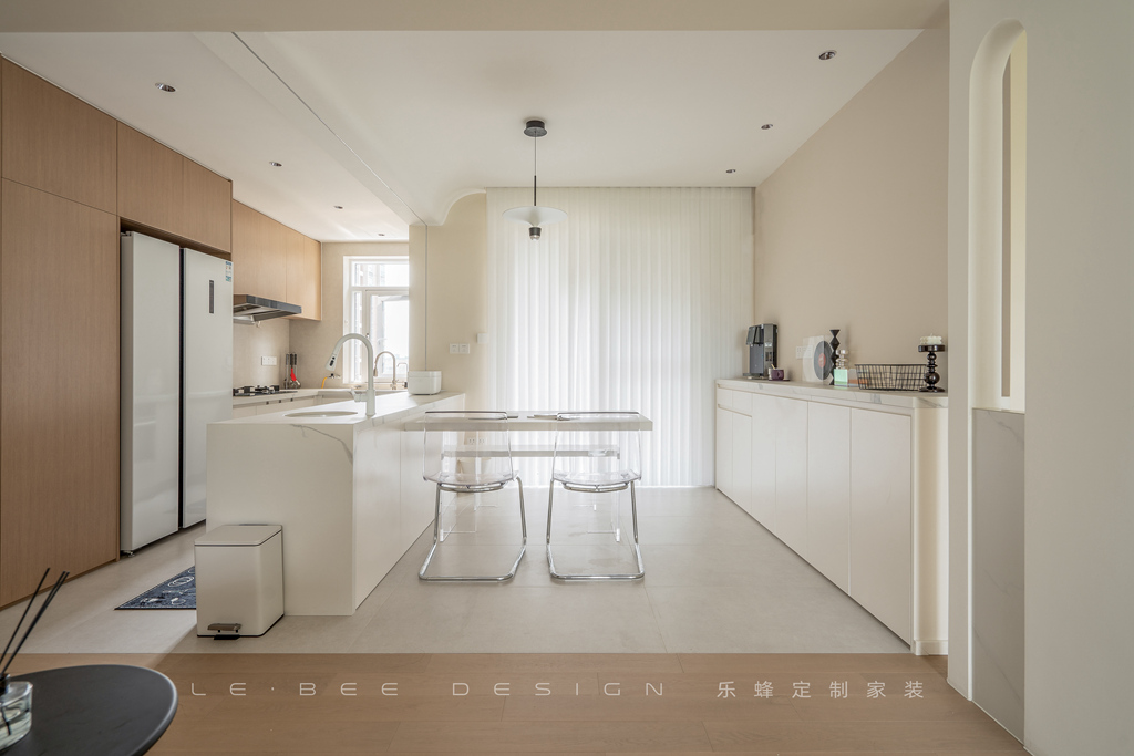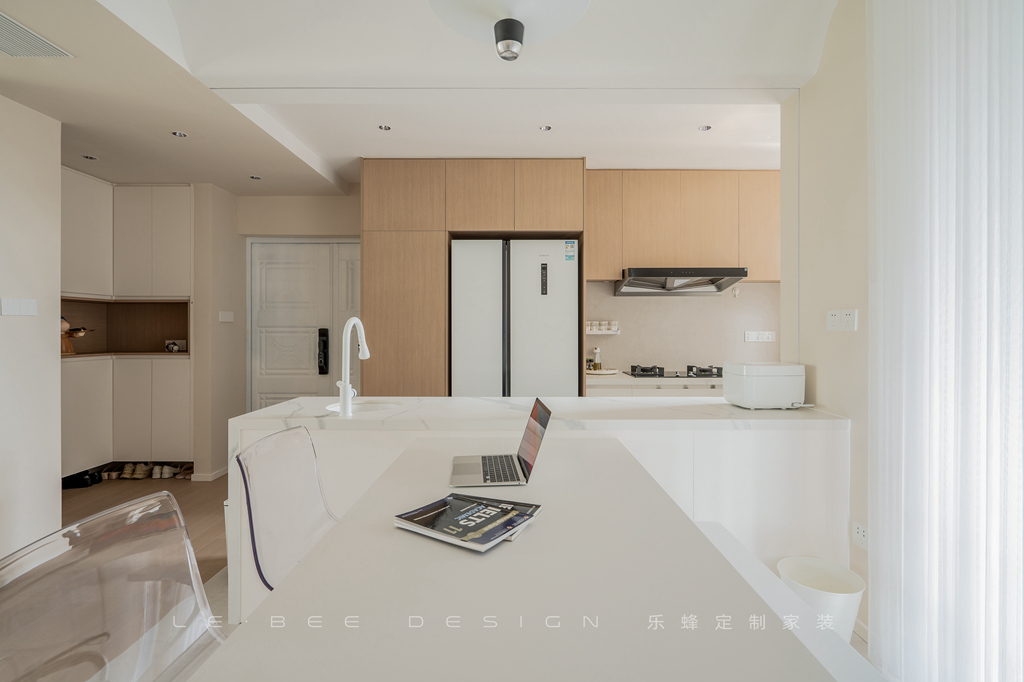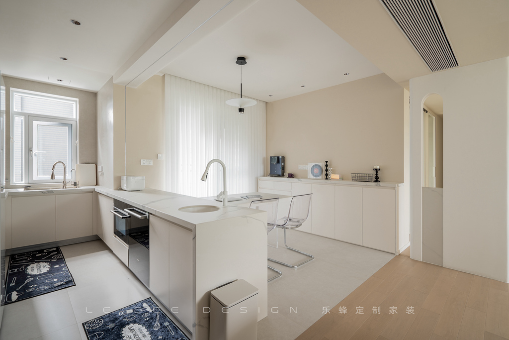 大理石導(dǎo)臺(tái),白色洗手池和多功能水龍頭。白色冰箱嵌入原木廚柜,烹飪區(qū)有獨(dú)特的地毯吸油污讓空間更干凈整潔。