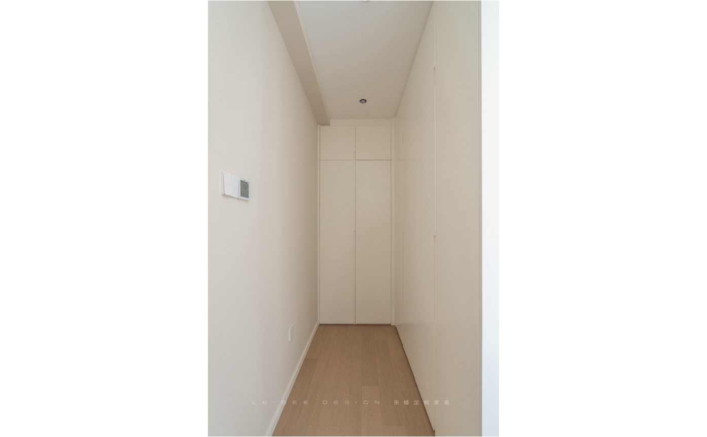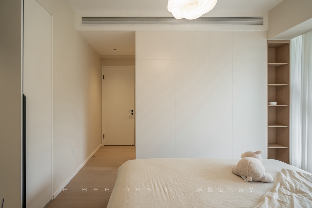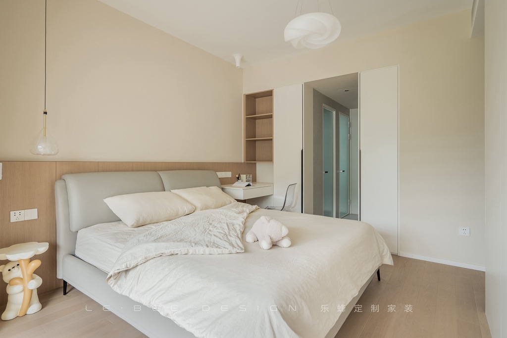 主臥室與眾不同,像是一朵隱藏在花叢中的花朵,給人一種獨(dú)特而隱秘的感覺(jué)。進(jìn)入主臥室左邊是衣帽間,簡(jiǎn)單而統(tǒng)一的色彩將整個(gè)空間襯托得更具私密感。