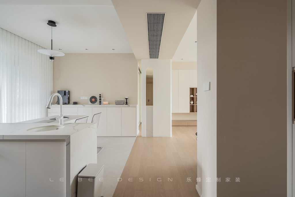 入戶設(shè)計(jì)簡(jiǎn)約而溫馨,就像一個(gè)溫暖的擁抱。白色的入戶門(mén)與整體風(fēng)格相得益彰,給人一種舒適的感覺(jué)。右邊的鞋帽收納柜讓回家后的換鞋和放包動(dòng)作變得輕松自然,同時(shí)打開(kāi)溫馨的燈光,瞬間營(yíng)造出賓至如歸的氛圍。往前走是一道屏風(fēng),其中的弧型空洞透過(guò)朦朧的視線勾勒出走廊的美感。